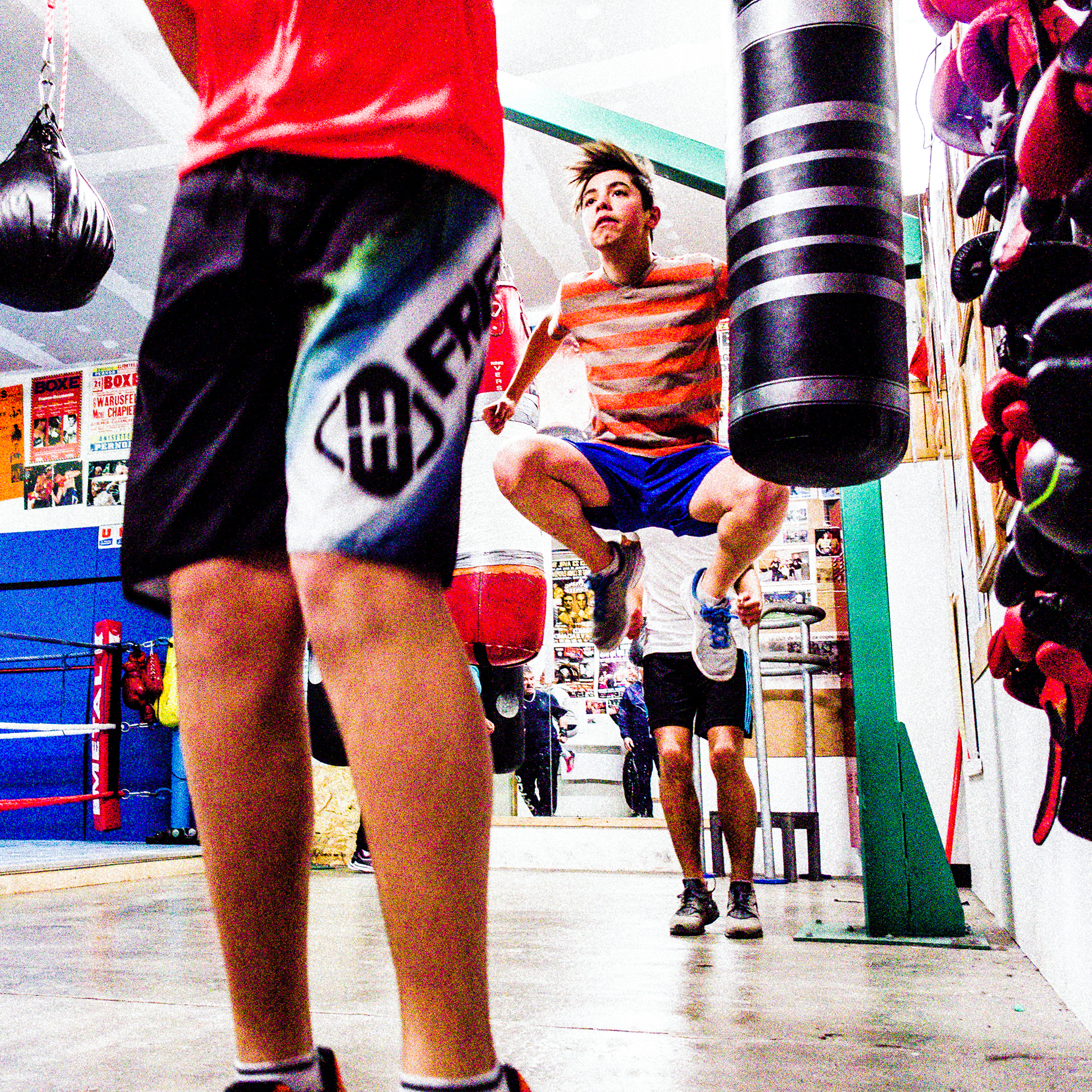 Ne pas se sentir attiré par l'aspect sport professionnel et photographie de compétition. Choisir de partir à la rencontre d'amateurs, d’hommes et de femmes (oui, de femmes !), de jeunes et de moins jeunes qui, juste pour le plaisir, prennent régulièrement le chemin de la salle de boxe pour s'entraîner. Courir, faire travailler ses muscles, transpirer, assouplir son corps, souffler, maîtriser ses pulsions, et frapper, frapper, frapper.. Ces amoureux de la boxe, je les ai rencontrés dans les Hautes-Alpes, à Embrun, au sein de l'association du Punch Embrunais. Merci à eux de m'avoir permis de partager quelques beaux instants et de mieux comprendre leur passion."